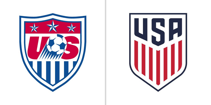 Drawing inspiration from the previous US Soccer logo's badge shape, the new USA national team crest simplifies a lot elements of the old crest, while also shifting the colors to darker and less cartoony shades of blue and red.